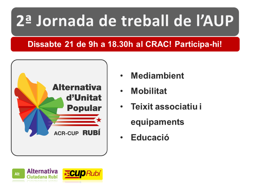 L’AUP continua amb les jornades per acabar de polir i aprovar els temes del pla de treball que hem anat fent fins abans de Nadal. Els objectius són fomentar la màxima participació dels rubinencs i rubinenques, ja que, com sempre, l’activitat és oberta a tothom, i millorar les propostes que fins ara hi ha plasmades a l’esborrador del pla de treball. En aquesta jornada tornarem a repassar les propostes de mediambient i mobilitat, i afegirem els temes de teixit associatiu i equipaments i educació.