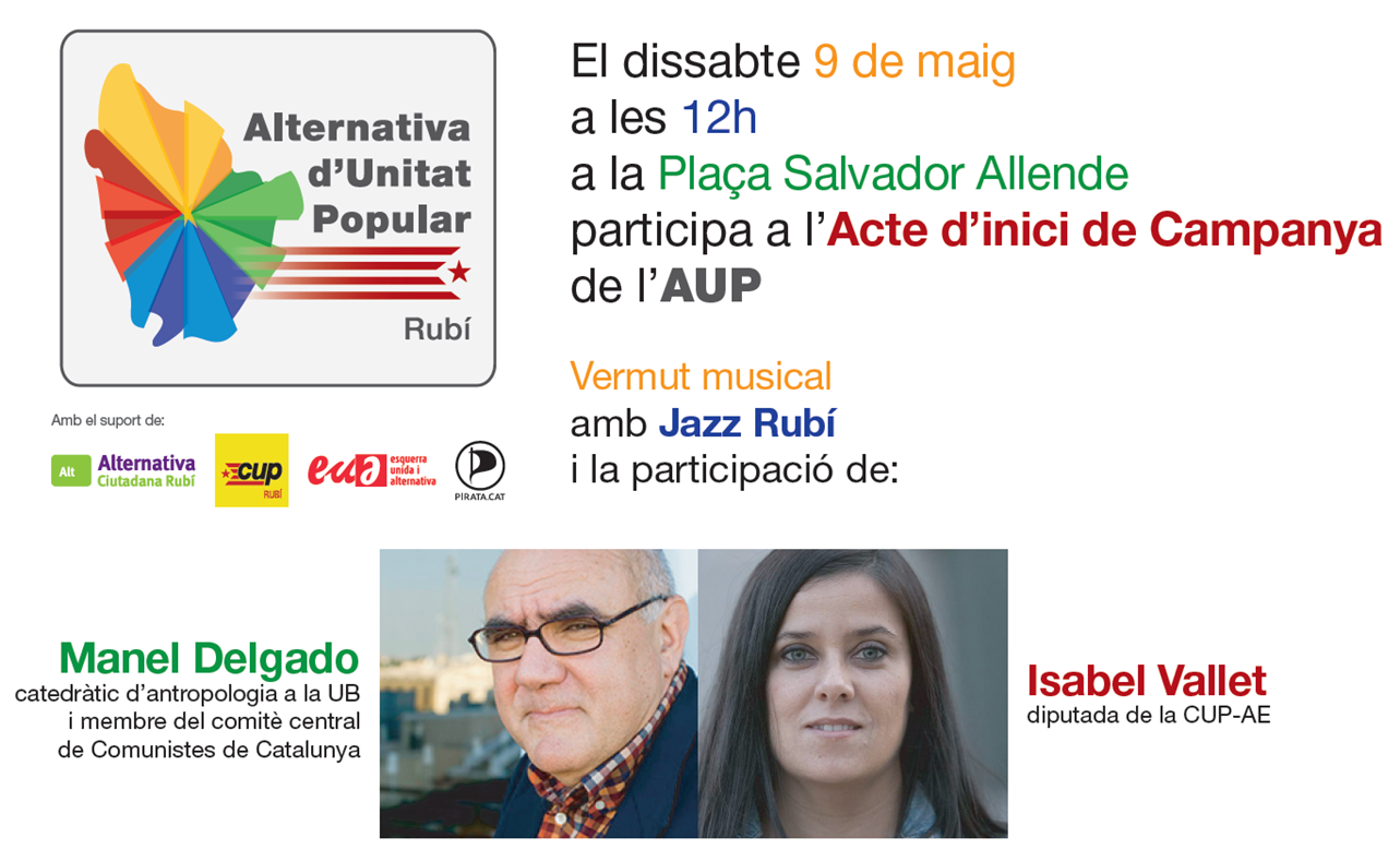 Aquest dissabte l’AUP arrencarà la campanya electoral amb un acte a la Plaça Salvador Allende, que comptarà amb la presència de la diputada de la CUP-AE Isabel Vallet i el professor Manel Delgado, catedràtic d’antrolopologia i membre del comitè central de Comunistes de Catalunya.
