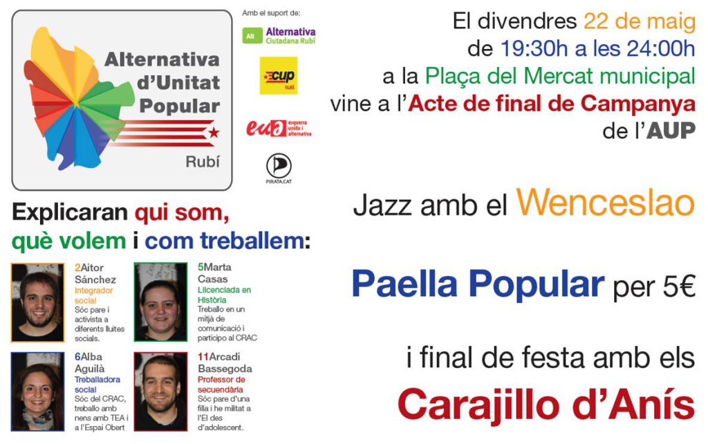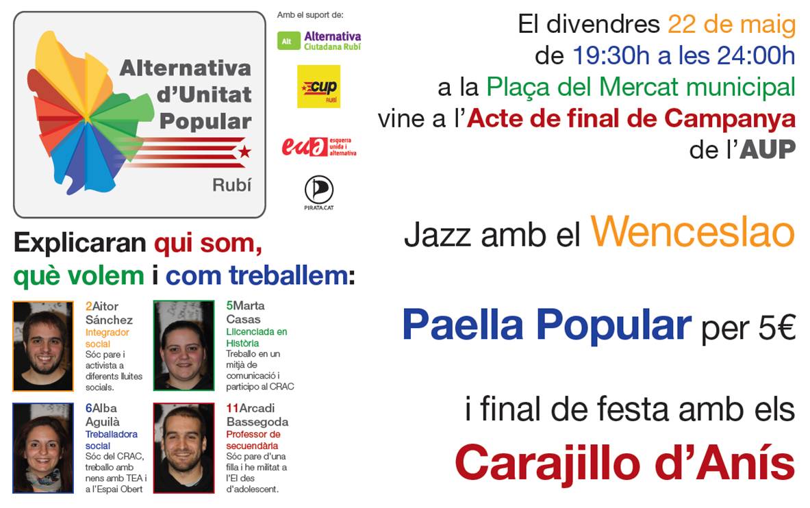 Aquest divendres 22 a partir de les 19:30h l’AUP celebrarà l’últim acte de campanya, que tindrà lloc a la Plaça del Mercat. Durant l’acte tindrem música Jazz del nostre company Wenceslao, paella popular a 5€ (el tiquet el podeu comprar durant l’acte) i concert final amb els Carajillo d’Anís. També hi serem per informar-vos de les nostres propostes i la nostra manera de fer política.