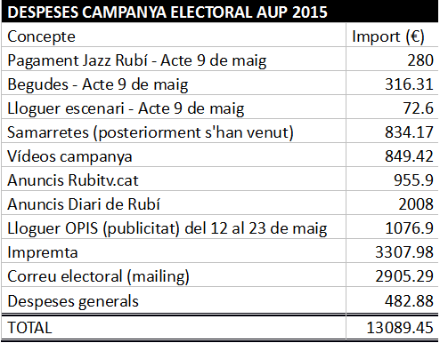 L’assemblea d’AUP va fer ahir el balanç de les despeses de la campanya electoral. La despesa final de la campanya ha estat de 13.089,45€, desglossat de la següent manera: