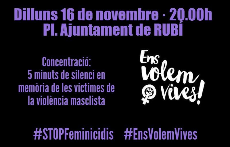 La concentració serà avui, 16 de novembre a les 20h, davant de l’Ajuntament. Convidem a tots els rubinencs i rubinenques a participar-hi, guardar 5 minuts de silenci en record de les víctimes, i alhora permetre’ns reflexionar sobre la xacra social que representen els assassinats masclistes en la nostra societat.