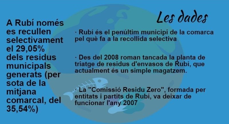 Per una altra banda, el fet d’instal·lar sensors en els contenidors de recollida de brossa permetrà obtenir dades, unes dades que creiem que no faran altra cosa que demostrar-nos la realitat, que no és altra que a Rubí no es fomenta prou la recollida selectiva i que això ens situa a la cua de la comarca, només per sobre de Gallifa, on la recollida selectiva se situa gairebé set punts per sota que a Rubí, on el percentatge és del 29,05%. Valorem positivament poder confirmar aquestes dades, però no serveix de res si no s’apliquen polítiques valentes en favor de la recollida selectiva, més enllà de les polítiques d’educació ambiental. Per altra banda, en la reunió amb l’equip tècnic, es va presentar una xarxa que combinava àrees de recollida selectiva amb àrees que només inclourien contenidors de rebuig i d’orgànica, per tant no és cert que es pretengui arribar al 100% de punts de recollida selectiva.
