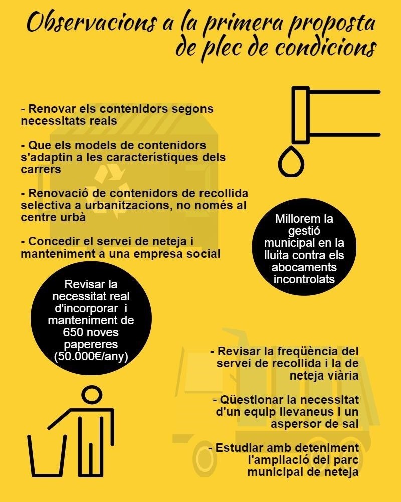 Malgrat tot, el nou plec de condicions inclou alguns elements que ens semblen positius, com per exemple la centralització dels residus reutilitzables en el “Centre de Reutilització (de manera provisional, a la Deixalleria de Cova Solera); o la incorporació d’un equip de neteja de marges dels camins públics del medi natural. El fet que es faci una concessió a només 3 anys (més tres possibles pròrrogues anuals, segons la informació del plec de condicions; tot i que en la reunió es va dir que serien dues possibles pròrrogues anuals) també ens sembla positiu.