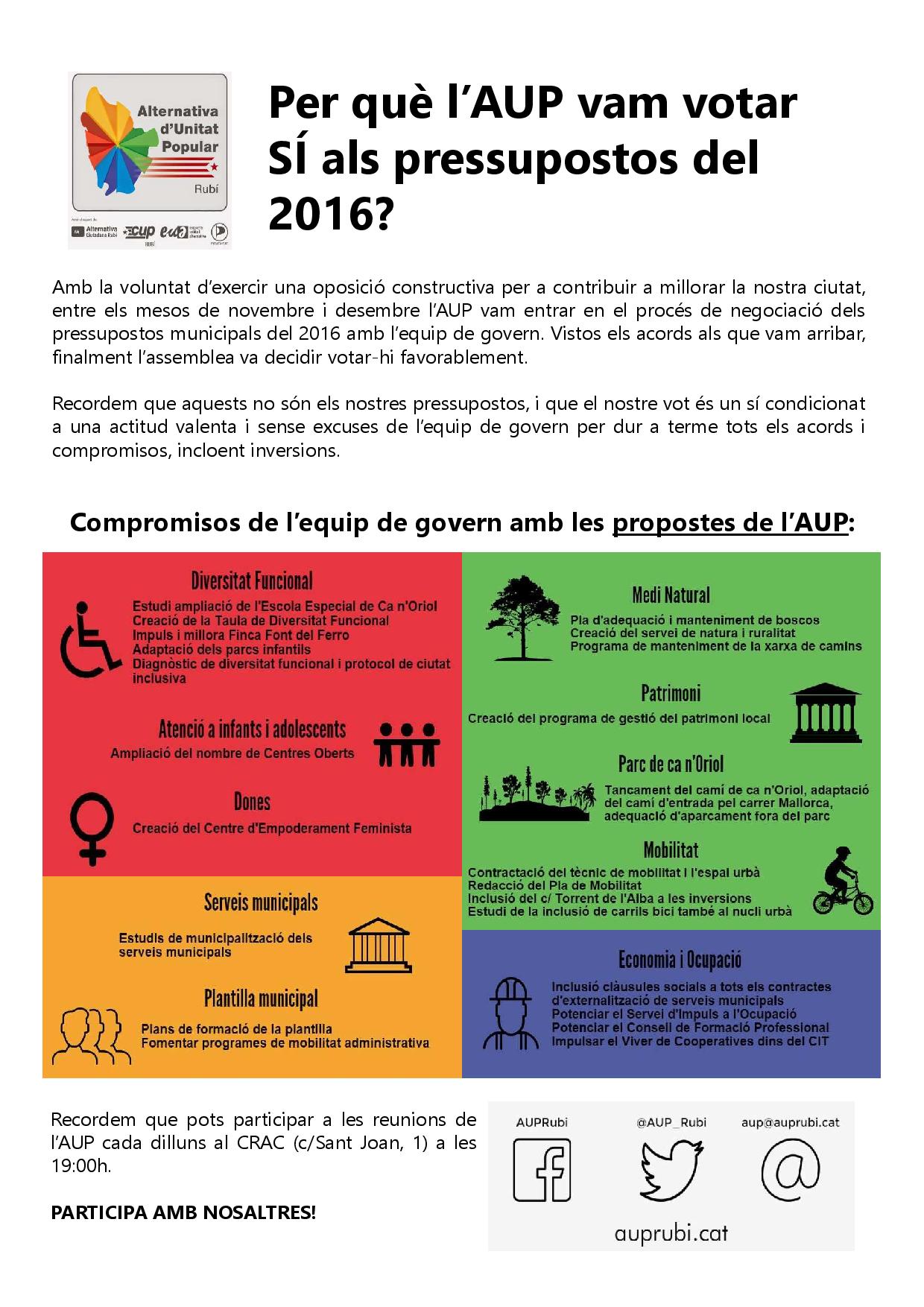Les propostes de l’AUP als Pressupostos 2016