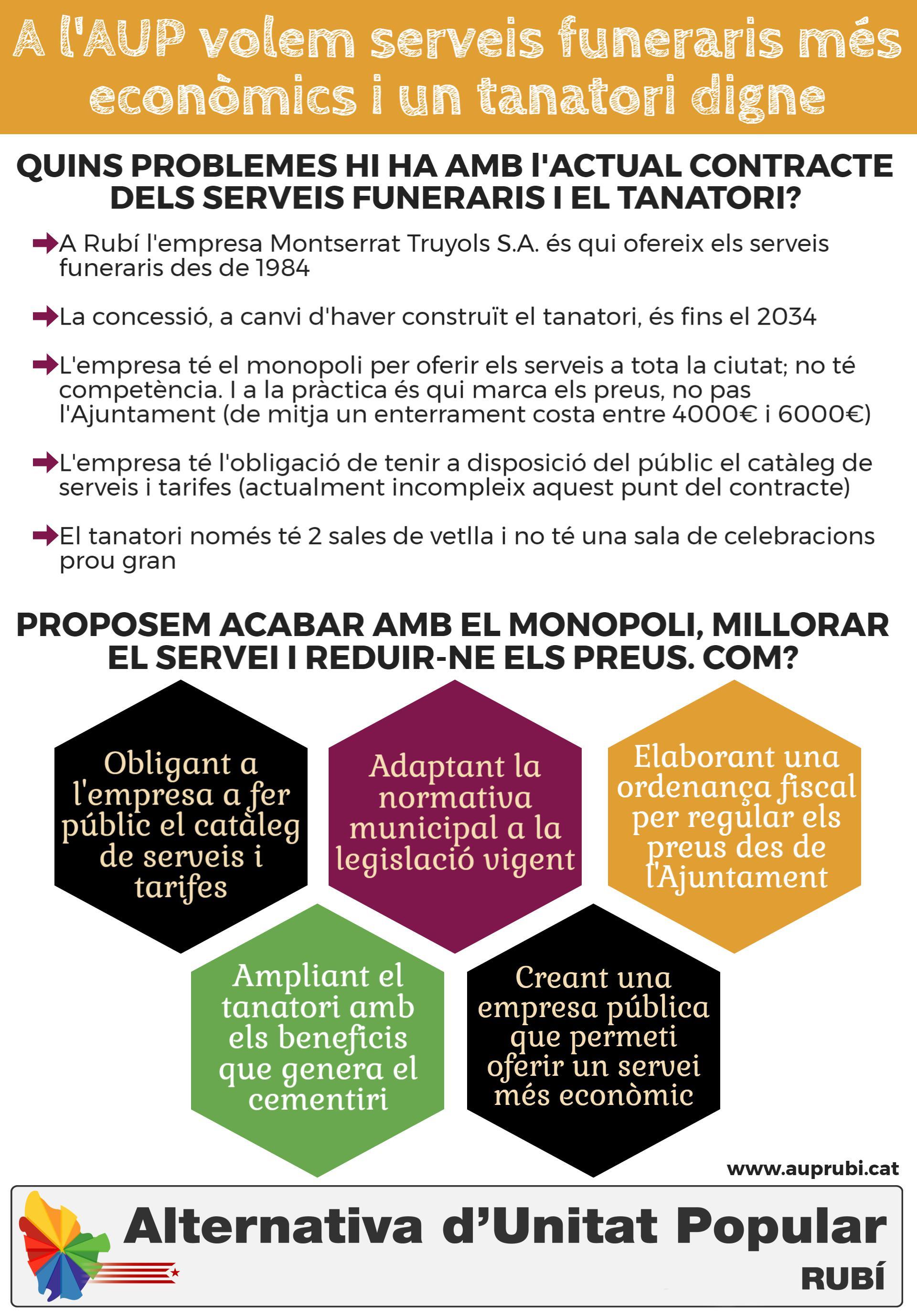 Els serveis funeraris són essencials i ningú en pot prescindir, són una demanda forçosa i de primera necessitat, que es produeix de forma imprevista i que requereix una decisió ràpida en un moment de màxima emotivitat. L’any 2005 a Catalunya, i Rubí n’és un exemple encara vigent, el 84% dels municipis només tenien autoritzada una sola empresa funerària. El fet de que existeixin aquests monopolis i de que es limiti la oferta és una de les causes de l’elevat cost que pot representar l’enterrament d’un ser estimat, que en el cas de Rubí calculem que pot estar entre els 4000 i 6000€, podent ser superior però difícilment inferior a aquest rang. De fet, un informe de l’Organització de Consumidors y Usuarios (OCU) indica que en algunes ciutats és possible un estalvi de fins a 2.000€, amb un promig de 900€, i que el que queda demostrat és que la concurrència d’ofertes, és a dir, la no existència de monopoli, es tradueix en una major diversitat de preus. Aquesta situació de monopoli genera indefensió a la ciutadania de Rubí, assumint preus desorbitats pel conjunt dels serveis prestats. La garantia del principi d’universalitat obliga a les empreses a prestar aquests serveis de forma gratuïta a les persones que ho requereixin per manca o insuficiència de mitjans econòmics determinant-ho l’Ajuntament a partir d’un informe dels serveis socials municipals. Aquests casos, però, són força excepcionals. Això fa que bona part de les famílies hagin d’assumir uns preus molt més alts del que poden assumir i es veuen obligades a endeutar-se per aquest motiu.