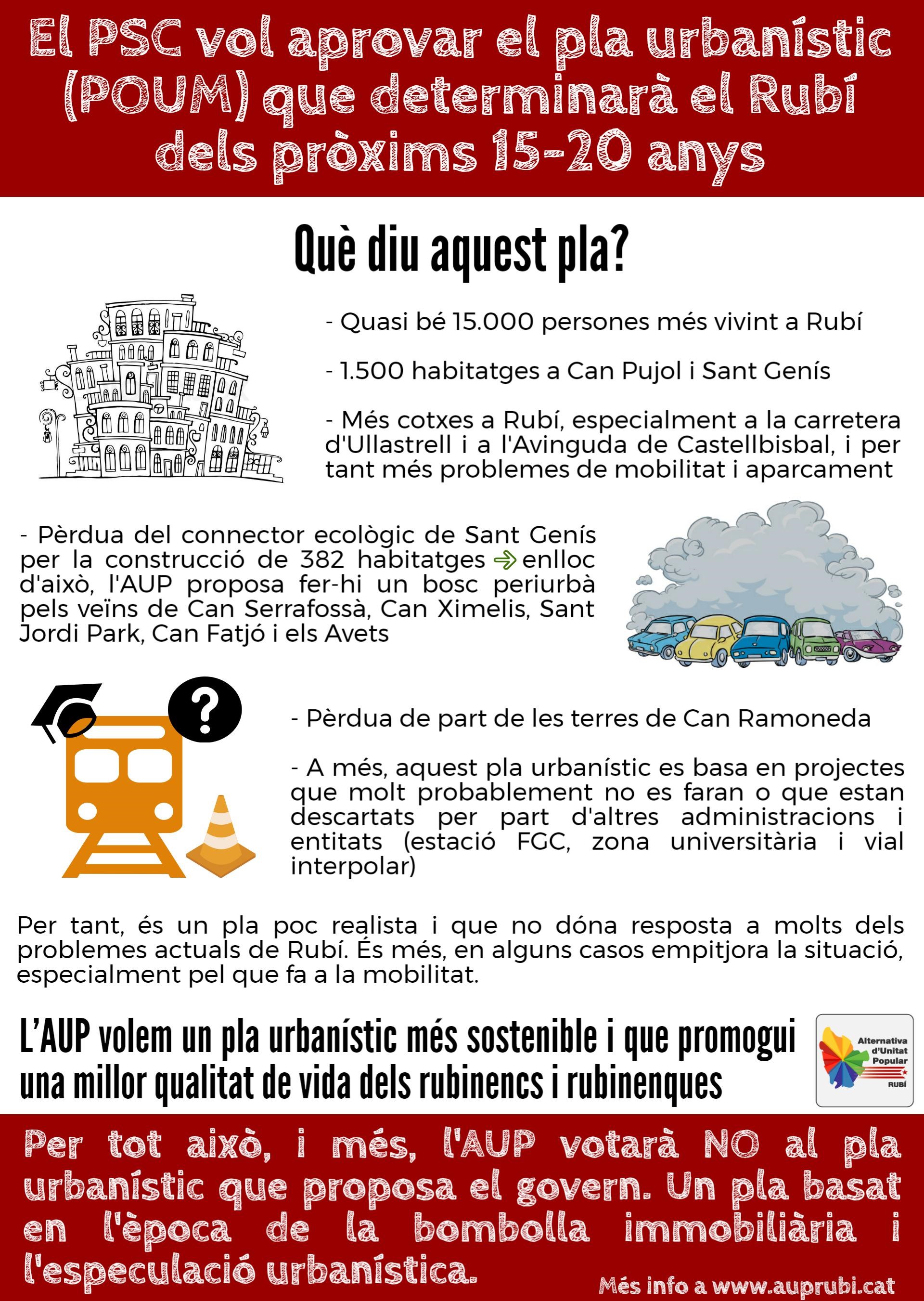 L’AUP hem anat publicant informació sobre el Pla urbanístic (POUM) que el PSC vol aprovar. Un POUM que es va començar a redactar el 2006 i que està totalment desfassat. La ciutat del futur l’hem de decidir conjuntament entre tots i totes.