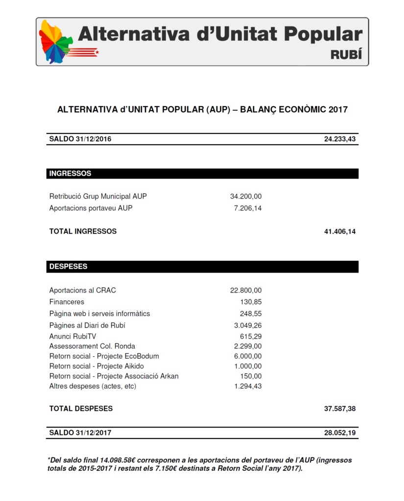 En aquest 2017 l’AUP ha ingressat 34.200€ de la retribució del grup municipal, a més de 7206,14€ de la part del sou a la qual renuncia el nostre portaveu.