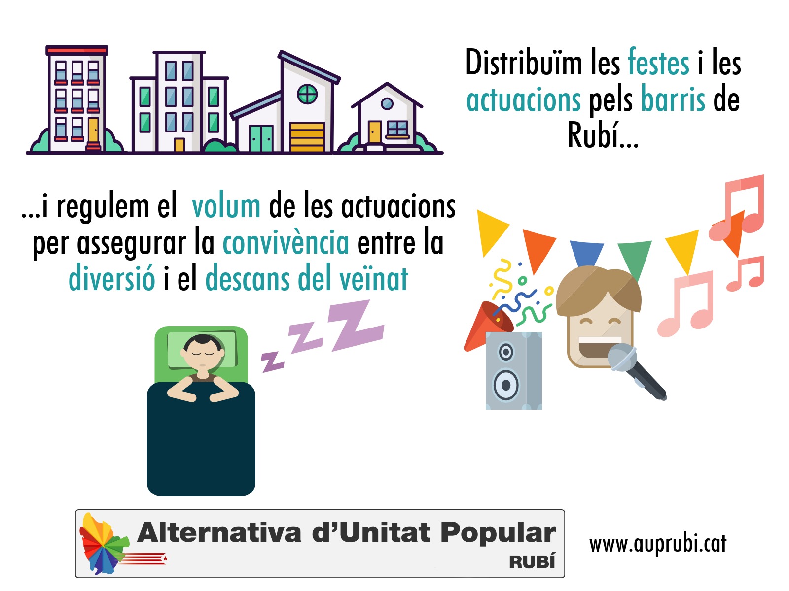 Aquest mes d’abril l’AUP portarà una moció al ple per instar a l’equip de govern a redactar un protocol que planifiqui una distribució més equitativa de les festes i actuacions que tenen lloc a Rubí. La moció també inclou un acord per tal que es redacti i apliqui un protocol per tal de regular el volum de les actuacions que tenen lloc en aquestes festes i esdeveniments, tenint en compte els horaris, les recomanacions d’exposició al soroll establerts per organismes internacionals, etc. La redacció del protocol hauria de fer-se amb la participació de diversos actors de la ciutat: entitats, associacions de veïns, serveis municipals de salut pública, cultura, joventut, policia municipal, etc.