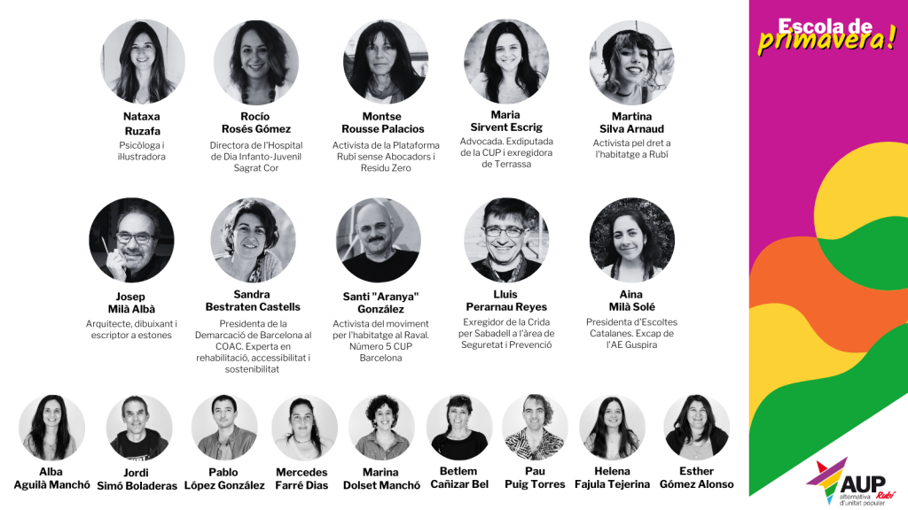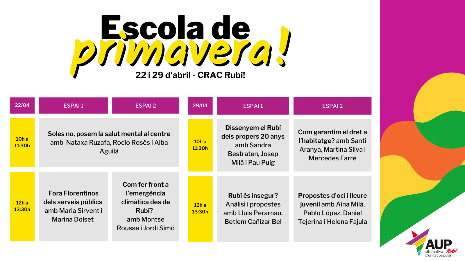 Els propers dissabtes 22 i 29 d’abril, de 10 a 13.30, al CRAC, tindrà lloc la 1a Escola de Primavera de l’Alternativa d’Unitat Popular. En diferents franges i espais simultanis conversarem amb persones referents i amb experiència sobre alguns dels reptes que Rubí encara en el present, i que són cabdals per a construir el futur de la ciutat.