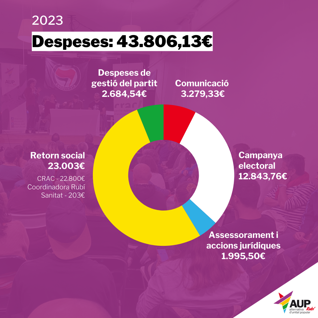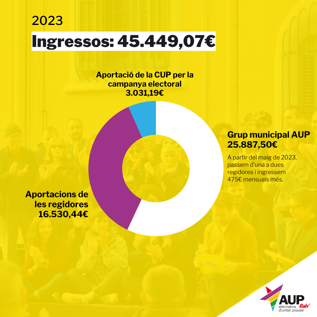 Com a candidatura política que defensa la transparència en les institucions públiques i el retiment de comptes, és essencial que siguem obertes també en la gestió econòmica de la nostra organització. Per això, cada any publiquem els comptes de l’Alternativa d’Unitat Popular, detallant clarament l’origen i la destinació dels fons que gestionem, ja sigui relacionats amb el Grup Municipal que ens representa a l’Ajuntament o amb les activitats de l’assemblea de l’AUP Rubí.