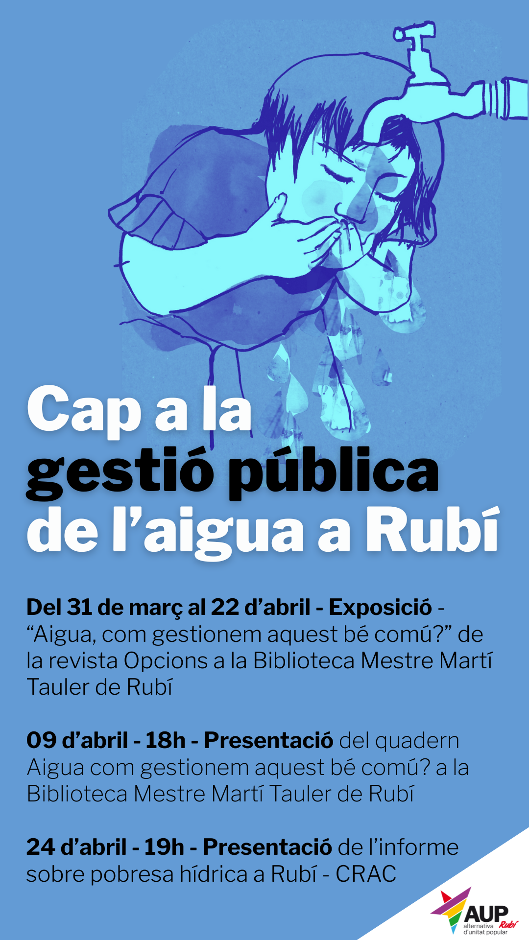 A Rubí, l’aigua està privatitzada fins al 2046 però des de l’AUP treballem per una gestió 100% pública d’aquest recurs essencial per la vida. Al gener de 2024, ja vam presentar i aprovar una moció per entomar la situació de sequera i escassetat d’aigua des de l’àmbit municipal.